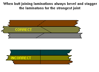 10. Glue up and put into place all of the back laminations, remembering to stagger the beveled joints approximately 1" from the centerline of the riser. See the following illustration.