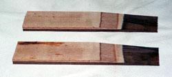The other component that is not found in a one piece recurve or a longbow is the wedge. The wedge is basically a stiffener/fadeout that is laminated into the limb. In a longbow or one piece recurve the fadeout is a integral part of the riser. The wedge dimensions will vary depending on design, but is usually from 3/8" to 5/8" thick and from 8" to 10" long. The parallel portion of the wedge is usually around 4" to 5" long with the tapered segment making up the rest. The end must be feathered out to a paper thin edge just like the fadeout in a longbow riser.