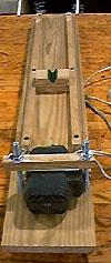 Under the main body I put two small strips of wood as feet. This allows the cords to be placed under the whole assembly and out of the way. I also mounted small rubber feet under the base. I drew a center line on the board and mounted my motor in line using two carriage bolts with wing notes. (Carriage bolts and rubber feet $3) The bracket over the top of the motor has some foam tape on the hidden side to help hold the motor in place and dissipate any vibration.