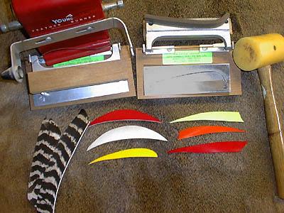 The more do-it-yourself methods involve chopping or burning feathers. The attached photo shows two feather choppers and a Young feather burner. To chop feathers you will need to purchase a feather chopper. The Little Choppers, available from most traditional archery suppliers, are a good choice. You will need to buy one for each size and shape that you want. They cost about $18 each. As an example, if you want a 5" left wing parabolic feather then you will need to buy a chopper for those exact specifications. I have an inventory of about 10 choppers in different shapes and lengths for both left and right wing feathers. If you want to chop but don't like the shapes that are offered, if you will draw out a exact scale of the shape you want, the manufacturer will make you a chopper to that exact shape. The one drawback that I have found with the choppers is that sometimes the feather will want to roll up as you chop it and you will get a slight variation in the leading edge of the feather. You can take care of this by trimming it off with a sharp pair of scissors. To chop the feather you just place a full-length feather in the chopper and give it a moderate rap with a rubber or rawhide mallet. If you are chopping 5" feathers I would suggest just trying to get one finished feather per full-length feather. Use the middle part of the full length feather for the best results. If you are chopping 4" feathers you can sometimes get two good feathers from a full-length feather.