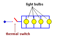 The next project that you will need to undertake is the construction of a heatbox. A heatbox is nothing more that an appropriately sized plywood box, lined with foil-backed foam insulation. The heat source is 4 - 150watt lightbulbs in ceramic bases wire in parallel. It's important to wire the bulbs in parallel so that if one bulb burns out during the baking time, the other bulbs will continue to produce adequate heat. These bulbs are usually placed in the top of the hotbox. You will also need a thermoswitch or regulator which will keep a constant temperature in your oven during the 7-8 hour bow baking process. Use 12 gauge wire that is designed for high temperatures if you run the wiring internally. You can use regular 12 ga. wire if you decide to leave the wire on the outside of the box. High temperature wire can be obtained at appliance repair facilities or at your local hardware store. If you wire externally, I would recommend that you use conduit to prevent accidental damage to the wiring. The following illustration is a wiring schematic for the hotbox.