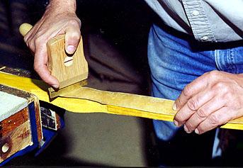 No great long setup time, either. YOU can begin final trim and cleanup within several hours. When the excess glue becomes gelatinous, it peels off readily. By then the rawhide will be dry enough to file or sand. Either with a second cut file or a large mill bastard, maintain one angle along the edge of the rawhide and, without removing wood, feather it into the bow's radiused edges for a neat and uniform trim.With warm dry weather or temperate use of your heat box, you can tiller and string, up within 36 hours.